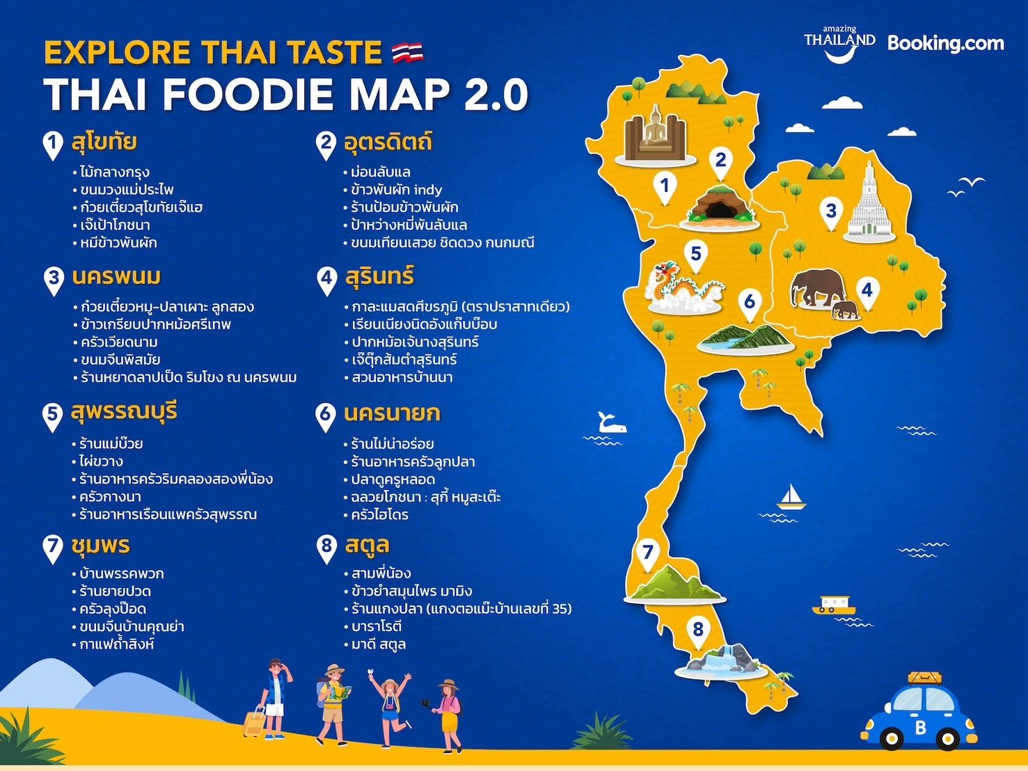 Booking.com与泰国旅游局在合作的第二年推出「泰国美食地图2.0Thai Foodie Map 2.0)」,这本旅游指南和地方美食地图专为美食爱好者设计,汇集了泰国各大旅游城市的推荐餐厅,供游客在#ExploreThaiTaste活动中尽情享受各类美食。