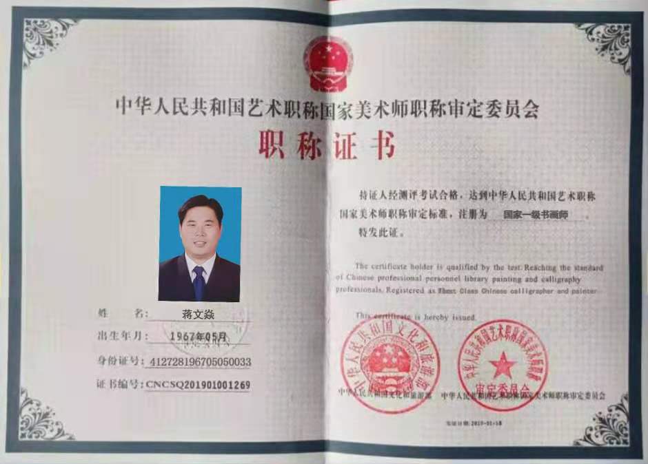 蒋文焱,原名蒋文化,号惊天居士,皈依法号释能文。自幼喜爱书法初学颜、柳贴,后习二王、孙过庭、米芾、赵孟頫、张旭、王铎等书法名家。现任中国青年书画家艺术研究院常务副院长,中国华佗书画院副院长!环球华人爱心书画家协会常务副理事长!河南广播电视台《中原视角》栏目组主任记者!中国实力派书画家!国家一级书画师!荣获中国校园优秀书画名家!环球华人爱心公益艺术家!十佳公益书画家!被中央文化部《追梦中国》大型文献一书和河南广播电视《文化中原》做专题报道!作品《沁园春“雪》荣获中欧文化交流匈牙利书画邀请展一等奖!