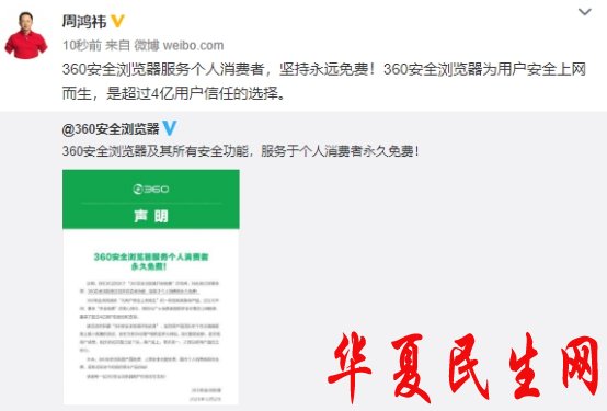 随后,360集团董事长兼CEO周鸿祎也转发该声明称:360安全浏览器服务个人消费者,坚持永远免费!