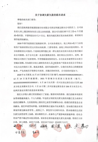 “出于信任与善意,我们帮公司解决困难才用信用卡、花呗等给公司垫了款,却没想到财务负责人的涉嫌职务侵占致使我们的钱到现在都没发放。目前,账单越来越大已面临逾期被诉风险,恳请上级领导施以援手,以解决劳苦大众生存问题。”近日,陕西港青旅国际旅行社有限公司西安凤城五路分公司的十几名员工致函上级有关部门反映说。