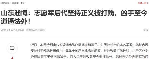 相关新闻:山东淄博:志愿军后代坚持正义被打残,凶手至今逍遥法外!
