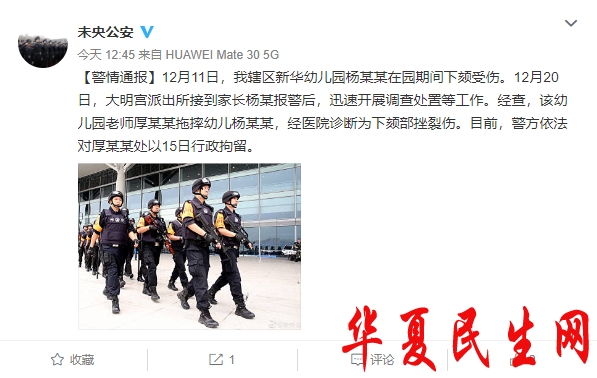 西安市公安局未央分局官方微博@未央公安12月23日发布警情通报:12月11日,我辖区新华幼儿园杨某某在园期间下颏受伤。12月20日,大明宫派出所接到家长杨某报警后,迅速开展调查处置等工作。经查,该幼儿园老师厚某某拖摔幼儿杨某某,经医院诊断为下颏部挫裂伤。
