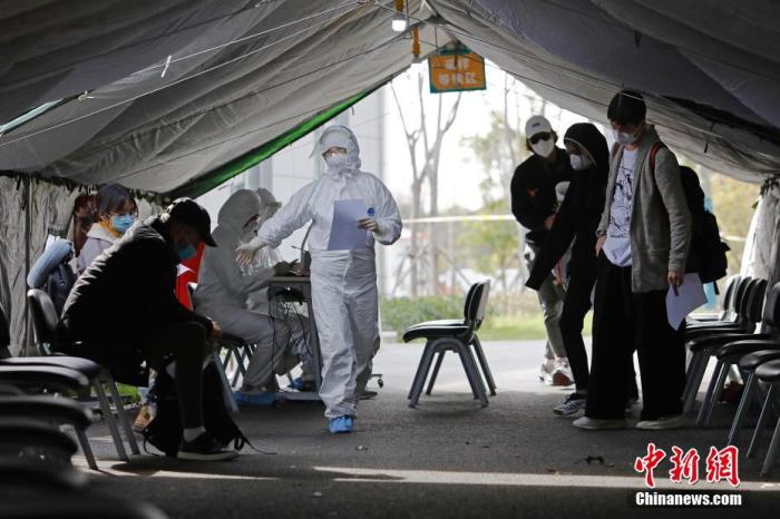 3月19日,在上海市长宁区的“集中留验点”,工作人员引导入境人员进行核酸测试。 中新社记者 殷立勤 摄