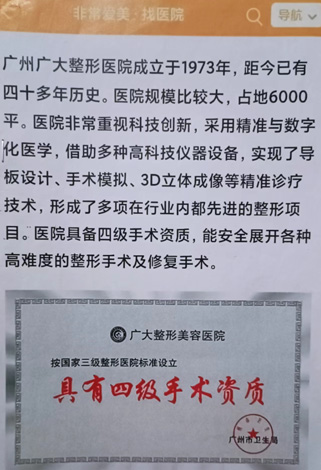 广大医院在广州荔湾区、天河区、越秀区,佛山禅城,佛山顺德,多个区域都开有医疗整形美容分院。医生柳某目前在3起地点执业:广大医院,韩妃整形外科医院(越秀区),柳大烈医疗门诊部。后去调查,广大医院只是一级综合医院(社区医院),医生柳某没有本专业的证件。该证件不适用整形手术,广大医院和医生柳某都没有这个资质。医院多年来屡次出现重大医疗事故,手术过程中经常出事故,既没有足够抢救设备和条件,技术和能力不足。