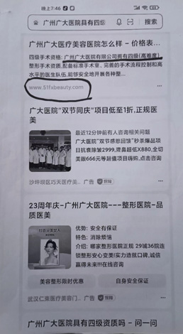 广大医院 在38个网站发布虚假广告内容全部都是打的颌面骨骼广告,术前术后案例,医生柳某是博士,开展磨骨取得了相关资质,截骨专利证书,具有四级资质的三级医院等等这些虚假广告,误导欺骗顾客前来消费,至今恶性循环蔓延全国。然而该院却否认38个网站的虚假广告是他们发布。
