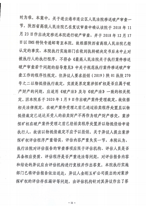 金刚五矿公司不甘于探矿权被执行完毕的事实,向西安中院提起执行异议,认为探矿权属于破产财产,应撤销西安中院将探矿权以物抵债给小贷公司的裁定。西安中院审理后认为,探矿权执行完毕在先,破产案件受理在后,故不属于破产财产,并作出(2020)陕01执异767号《执行裁定书》,驳回异议。金刚五矿公司不服,向陕西省高级人民法院提起复议。