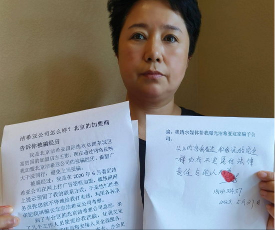 我们是北京洁希亚国际洗衣总部重庆市万州区的加盟商姚春梅、林晓平,我们今天通过网络媒体揭露北京洁希亚国际洗衣总部卖给我们的机器设备怀疑是二手翻新、虚假宣传、售后服务无保障等诸多问题。我们愿意对反映问题的真实性负责,如有不属实,愿意负法律责任,与他人无关。并通过我们的被骗经历提醒广大加盟商,北京洁希亚国际洗衣总部在网上宣传的所谓机器设备好、优惠活动力度大、后期总部全程扶持等承诺涉嫌虚假宣传,不要上当受骗。林晓平、姚春梅提供的事情经过:我们是2019年加盟的洁希亚干洗店,当初之所以决定加盟北京洁希亚国际洗衣总部,是因为北京洁希亚国际洗衣总部的业务员王超介绍说他们是全国知名品牌,总部在北京,机器耗材都是最先进的节能环保产品,还有强大的售后服务和保障等等诸多承诺。在北京洁希亚国际洗衣总部业务员王超的轮番洗脑下, 我们最终决定加盟北京洁希亚国际洗衣总部,一共投入25万多元才将这个加盟店开起来。