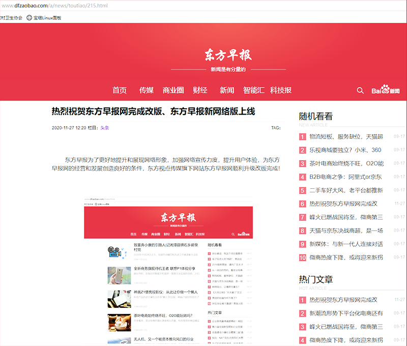 东方早报(www.dfzaobao.com)为了更好地提升和展现网络形象,加强网络宣传力度,提升用户体验,为东方早报网的经营和发展创造良好的条件,东方视点传媒旗下网站东方早报网顺利升级改版完成!