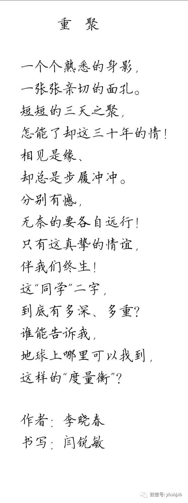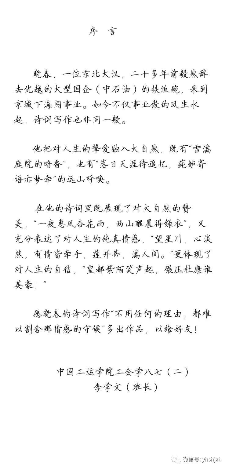李晓春和闫锐敏是30多年前,在北京中国工运学院时同窗两载的同学。毕业后,经常保持联系,几乎每年都要聚几次。毕业后,他在北京先是开了一个小卖铺,不久又开了一个超市。起初我们以为他只会做生意,但是,自从有了微信之后,在朋友圈发了几首格律诗,而且合辙押韵,才发现他是一个才子。接下来,就让我们欣赏他的杰作吧!