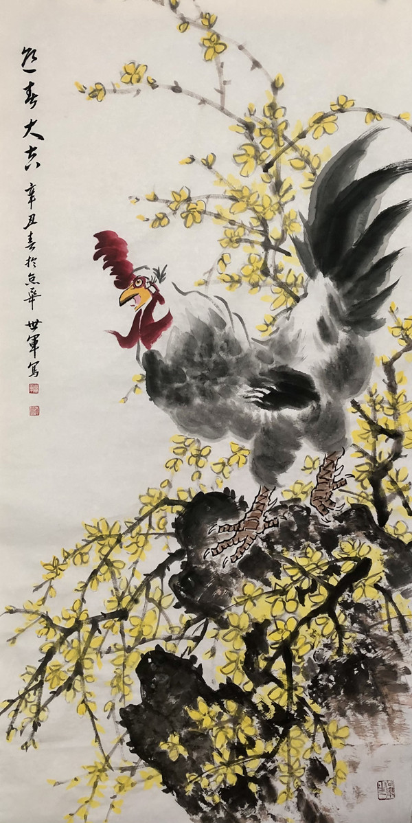 王先生作画,题材广泛,博涉多优,尤其以画雄鸡、紫藤寄寓吉祥而闻名遐迩!能够在画史为自己的艺术造诣赢得重要坐标,不能依靠普通的画题作证!唯有专题专享、独门独技方可以功传春秋,古今相望。比如郑板桥画竹、齐白石画虾都是这种情况。当下,王世军先生以独树一帜的紫藤图雄鸡图,作出了亘古未见的大功勋,成为盛世雄鸡创作的第一笔!也贵有引涉紫气东来的玄机功夫!