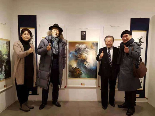 林家同院长向参观者展示自己构思奇巧的巨幅山水作品。