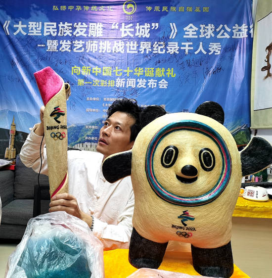 黄鑫先生积极响应“三亿人上冰雪,十四亿人迎冬奥,全民运动健康”的倡导,将历时数年在全国范围内征集到的华夏56个民族人、奥运冠军、世界冠军、名人名家、企业家、爱心人士、长发世界纪录保持者和冰雪爱好者等人士的头发,运用独特的发雕艺术、复杂的制作手法,经过头发收集、拆分、挑选、清洗、消毒、晾晒、长短区分、色彩处理、绘图、雕塑等多道工序,最后创作出了长72公分、重1.4斤(代表了14亿人民)的奥运圣火“火炬”和高56公分、重5.6斤头发(代表56个民族)的中国北京冬奥会吉祥物“冰墩墩”。