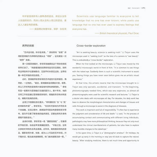 最后一点,也是本书的最后部分——后记。这原是《北医人》记者徐璐对李铁军教授的专题访谈,题为《显微镜下的美丽相遇》,图文并茂,文中有三个小标题: 从“艺术青年”到“医学青年”, 跨界的探索,科学与艺术在山顶相遇。