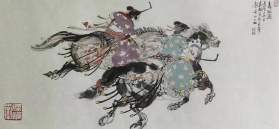 袁辉和杨国新主要以人物表现为主。袁辉人物画创作重在用线,取自书法中的线条,凝练概括中极具表现力,所以,袁辉的人物画均以线造型,以线条的表现语言构建起画面整体的叙事逻辑,由此形成的人物形象所具有的审美情感都是愉悦的、轻松的,这是线条的魅力,是书法线条转换衍生的魅力,也是以线造型所形成的人物情感和人物精神状态的自觉塑造与主动表现。