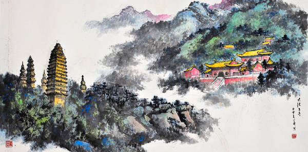 端砚与佛教结缘,早在宋代就已经开始,此后便一直绵绵不绝。其图案主要为两种类型:一种是雕刻佛教人物形象,如佛祖、菩萨、罗汉等;另一种就是雕刻佛教寺庙建筑。这套“百刹砚”属于后一种类型。虽然古已有之,但是纵观古今我国各个砚种,还不曾有哪一个砚种将全国各地著名寺庙纳入自己的创作中。所以,这套“百刹砚”是既有继承又有创新的。这不仅是敢于构想扩大数量的简单问题,其间还需要走访这些散布在我国四面八方的古代名刹,仔细观察体验,绘制这些古代名刹独特风韵的图案。这是一项需要时间,更需要艺术匠心并付出艰辛劳动才能完成的工作。韩光森先生是个有心人,作为山水画家,他早就敏锐地感受到了古代佛寺建筑与山水风景的密切关系,因此在他几十年的绘画生涯中,已经积累了许多佛寺建筑和山水名胜相结合的作品。正是有这样一些作品为前提,所以才会有这个“中华百方古刹传世精品端砚”的创作实施。