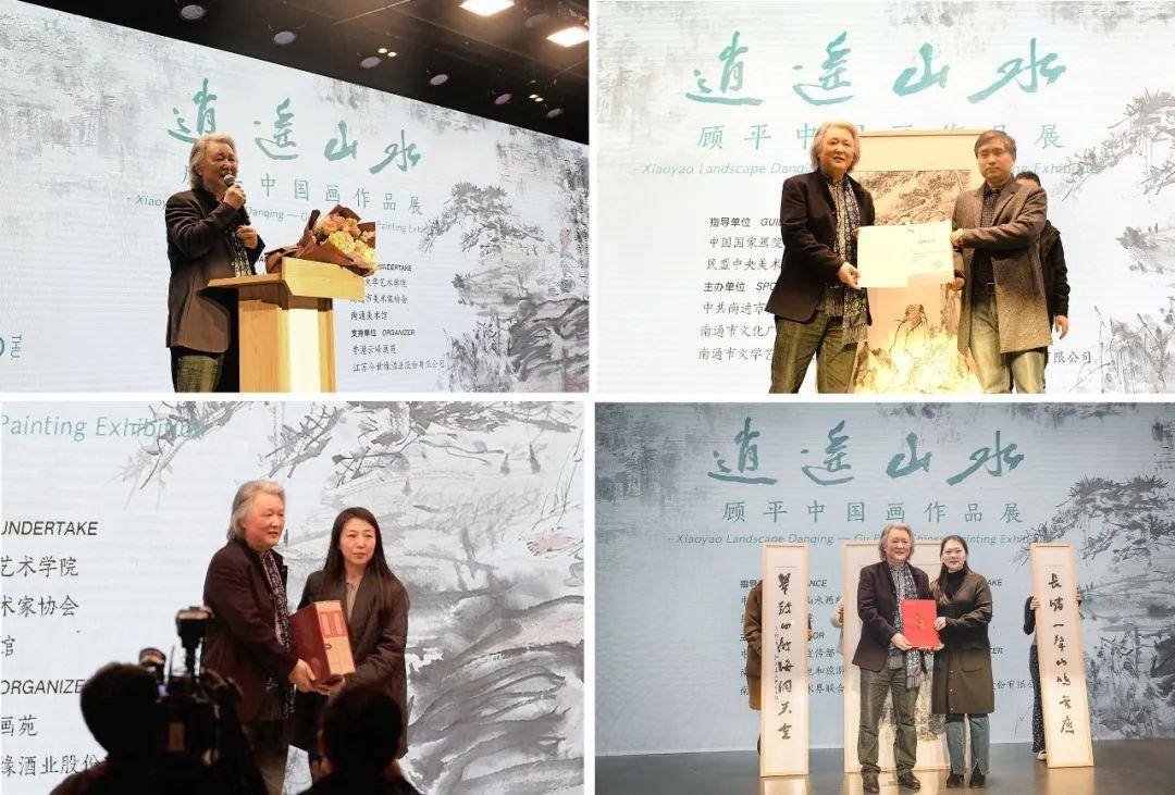开幕式上,顾平深情回顾了其与南通的多重渊源,真切表达了其回乡办展的艺术初心,并现场向南通美术馆、南通大学艺术学院捐赠了中国画作品和艺术著作《中国画院史》。他表示将在今后的艺术创作中进一步挖掘“逍遥山水”的艺术精神,将这种绘画图式的艺术气质和文化观念进一步渗透在人与自然的深度融合中。