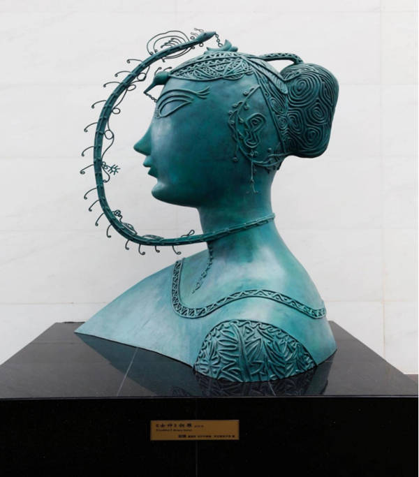 器愈卓越,道愈高远。美学家宗白华先生在《美学散步》一书中说,中国传统美学分为“初发芙蓉”和“错彩镂金”两种美。“初发芙蓉”是一种质朴清新之美,“错彩镂金”是一种富丽浓郁之美。在网红长沙“全球最大的艺术家个人美术馆”——李自健美术馆安放着欧偲的作品《女神》。这是李自健老师在众多的参赛作品中选定的,以纪念他心爱的妻子丹慧老师。这一清秀美作品是欧偲进行了深入探究和细致摸索,突破铜雕窠臼,创造出新装饰方法的一个传世名作。现代雕塑陈列安放在美术馆的公共空间,让一座现代化的艺术殿堂,有了更浓郁的浪漫气息与艺术遐想。