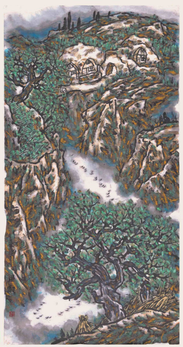 像范宽这样伟大的北宋山水画巨匠,画史对他的生平记载却很简略,究竟生于何年,殁于何载,只是个大约年号。其它诸如绘画活动、艺术、思想等除三言两语外,一片空白,这可能因为范宽是平民画家的缘故吧。因此,对于范宽其它史料的记载是否真实无误,或有偏颇,就大有商榷之处。有趣的是,1989年冬,我去照金山脉写生,鬼使神差,突然感悟到范宽山水画的根脉就来源于鲜为人知的照金山脉。一天清早,我准备上山写生,拉开门,纷纷扬扬的鹅毛大雪,覆盖了大地,一片迷茫。我庆幸在这大山中,能看到如此美妙的雪景,真乃天赐我也。稍停,大雪渐止,我差点惊呼:眼前之景不就是范宽的《寒林雪景图》吗?于是,我在后边的写生过程中,便留意对这里的几座名山、溪流、瀑布、山崖、坡地、林木等进行观察研究,并作焦墨写生数十幅。渐渐地把范宽的《溪山行旅图》与照金山脉联系起来,岂非天作之合。既然“范宽故里距照金很近,起步可至,那么,在古代交通、讯息极不便利极不发达的情况下,范宽难道可以舍此壮美山水,忘情远方山水乎?这里并不否认史书记载范宽“多往来雍、雒间”,又“移居终南山、太华山,终日观览山水,以求其趣”的史实。作为山水画家,博览广采,吸纳更多营养,胸有无尽丘壑是山水画创作的必备条件。但我要阐明是,范宽山水画的气象、气质、魂魄及精神内涵是以照金山脉为根基的。尤其《溪山行旅图》,作为范宽山水画的代表作,更是集中体现了照金山脉的雄浑博大与恢宏壮阔。不论从自然景观和人文景观考察,这无疑是一件地域性很强的宏图巨制和伟大作品。范宽“师古人,末若师诸物也,吾与其师诸物,末若师诸心”的艺术主张,在这件作品中,得到了最鲜明的体现。 《溪山行旅图》画面中央的主峰,如巨碑矗立,伟伟乎直冲霄汉,显示了画家浑厚雄强、顶天立地的精神气度。山顶上灌木丛生、密而有序、一派苍茫气象。如线一般的瀑布,自山体腹间流出,涓涓有声,美妙无比。主峰右侧有一低矮山峰,与主峰对坐,形成呼应。中景以上,雾霭蒸腾,烟岚迷漫,使整幅作品产生了一种强烈的高耸、伟岸之感,也与上端产生了距离。中景两崖间,瀑布喷泻,飞流激荡而出,汇成溪流山涧,流出画面。两崖上树木茂密生长,各尽其态。顶端有似针叶一样的林木,屋宇楼阁藏于其后,错落有致,耐人寻味。近景巨石横卧,坚不可摧,这无疑对画面耸立感起到稳定作用。近景与中景间,几条横线,形成沙石坡角。四条小毛驴负重夺路而出,两个北方汉子一前一后,赶毛驴匆匆前行。这无疑对厚重、深邃的《溪山行旅图》增添了一种轻松愉快的感觉,使画面产生了音乐感和灵气。