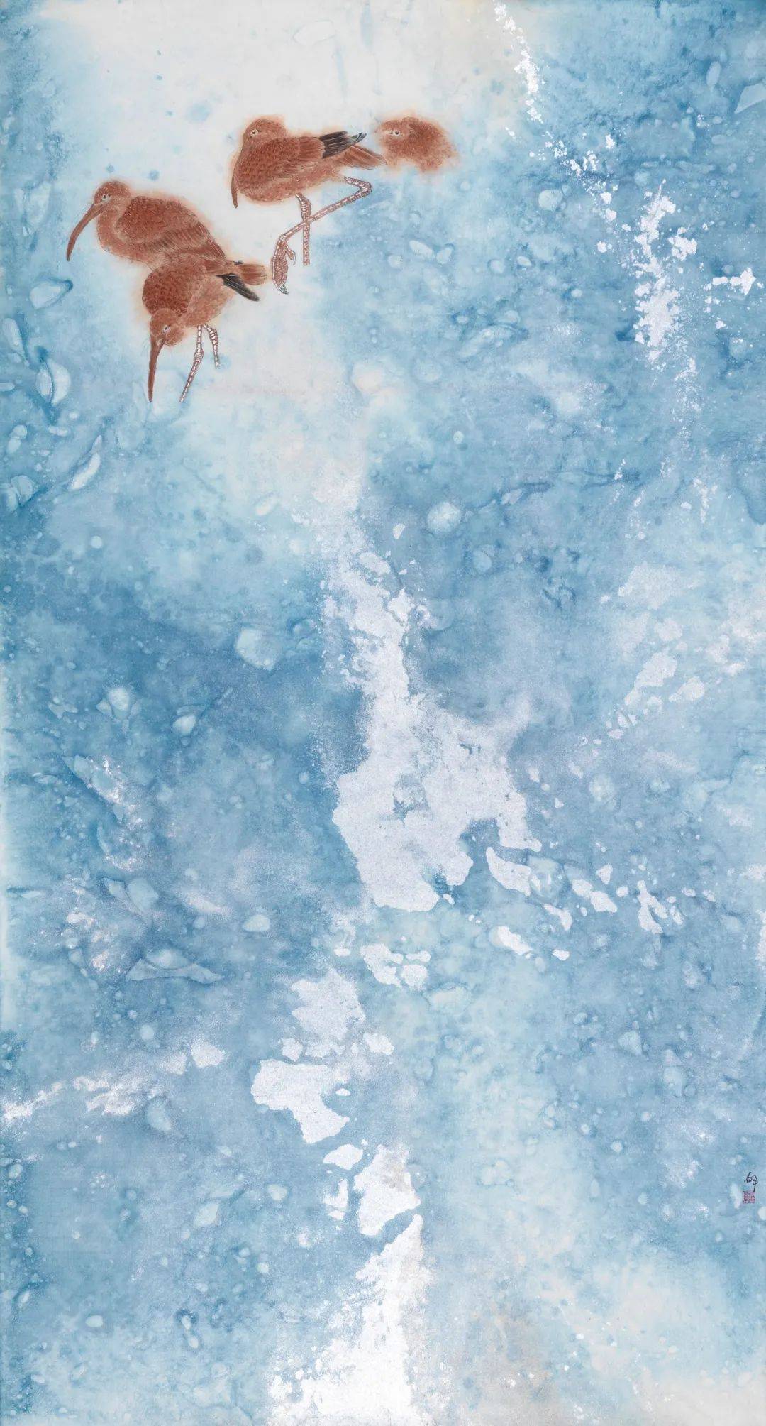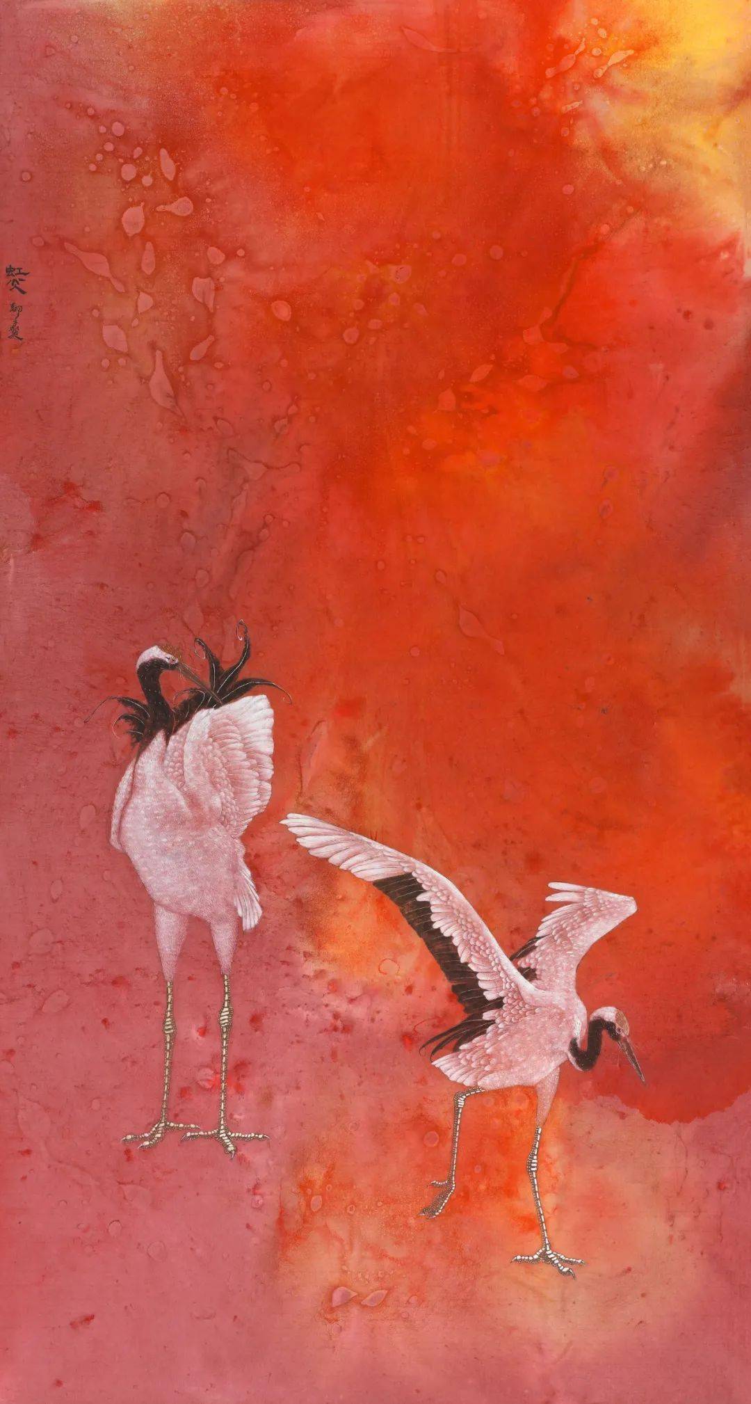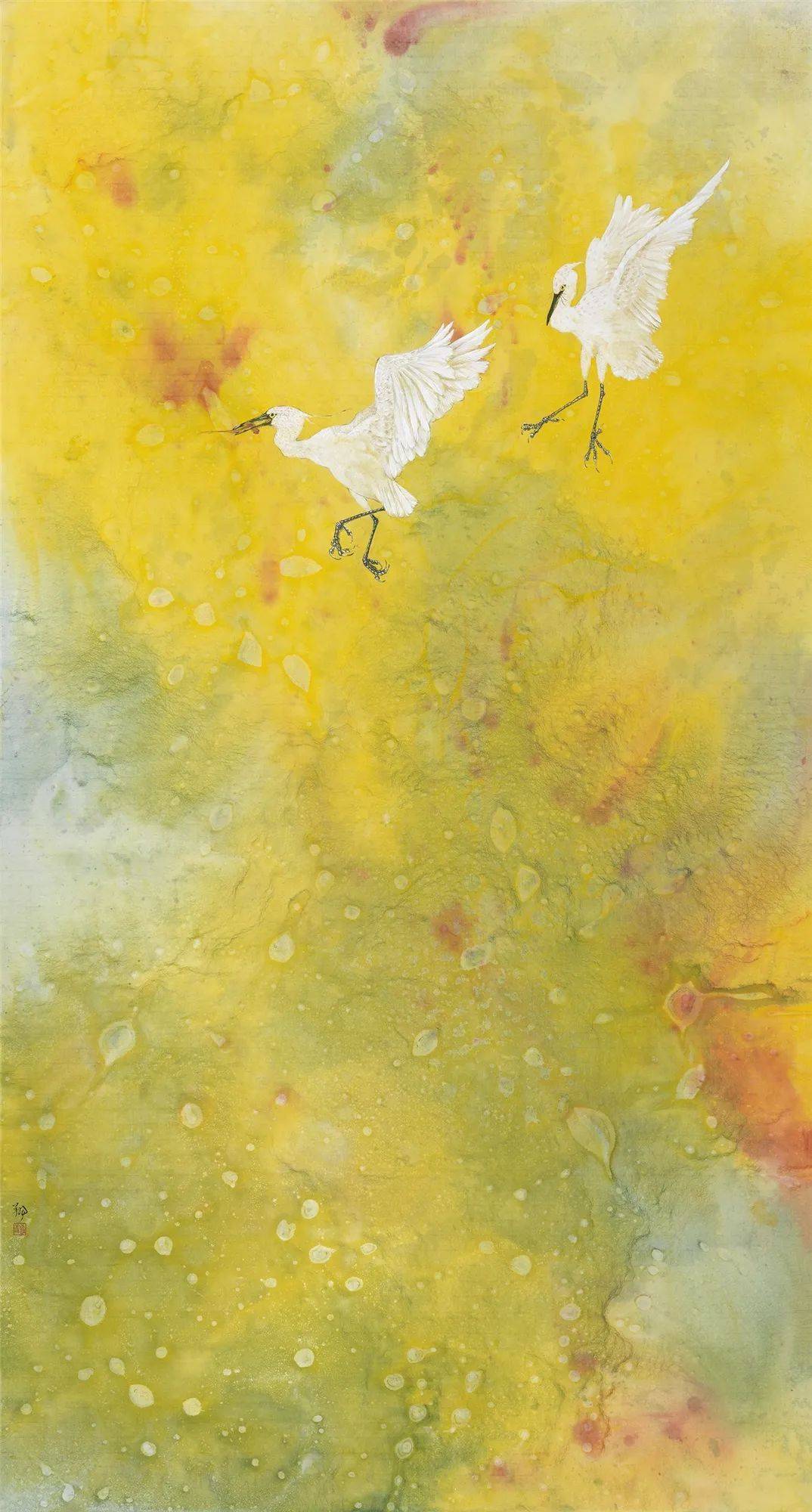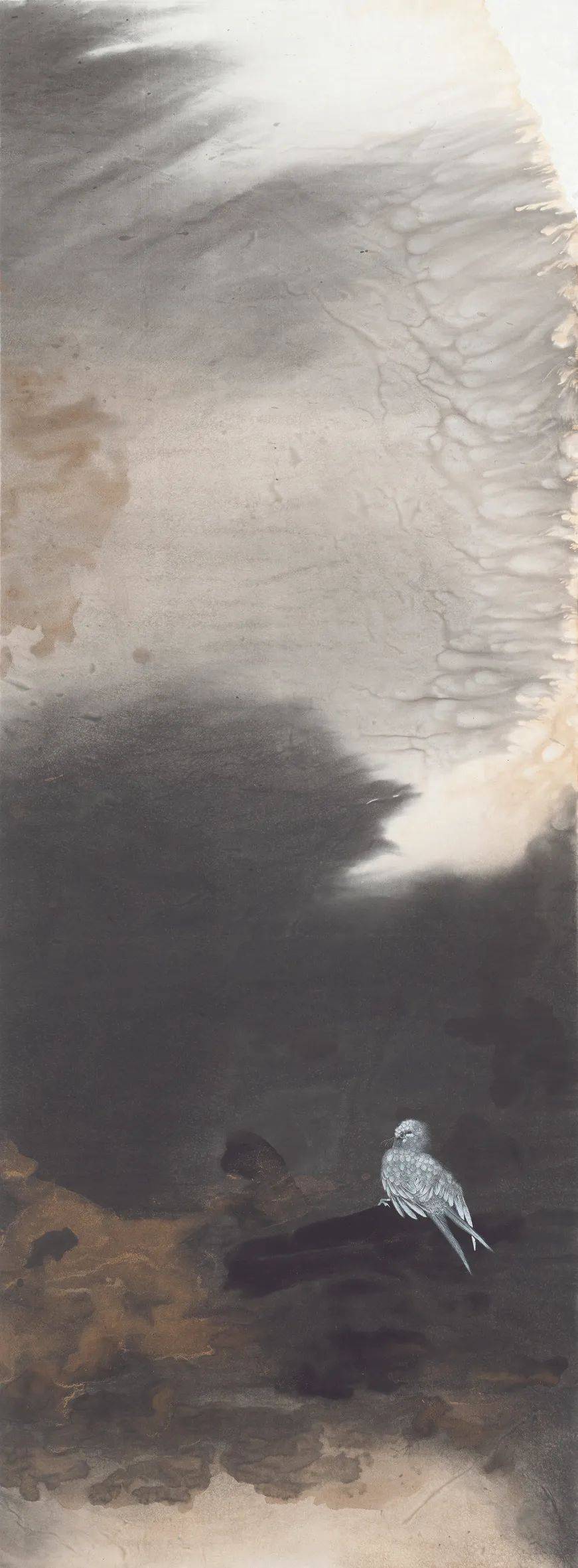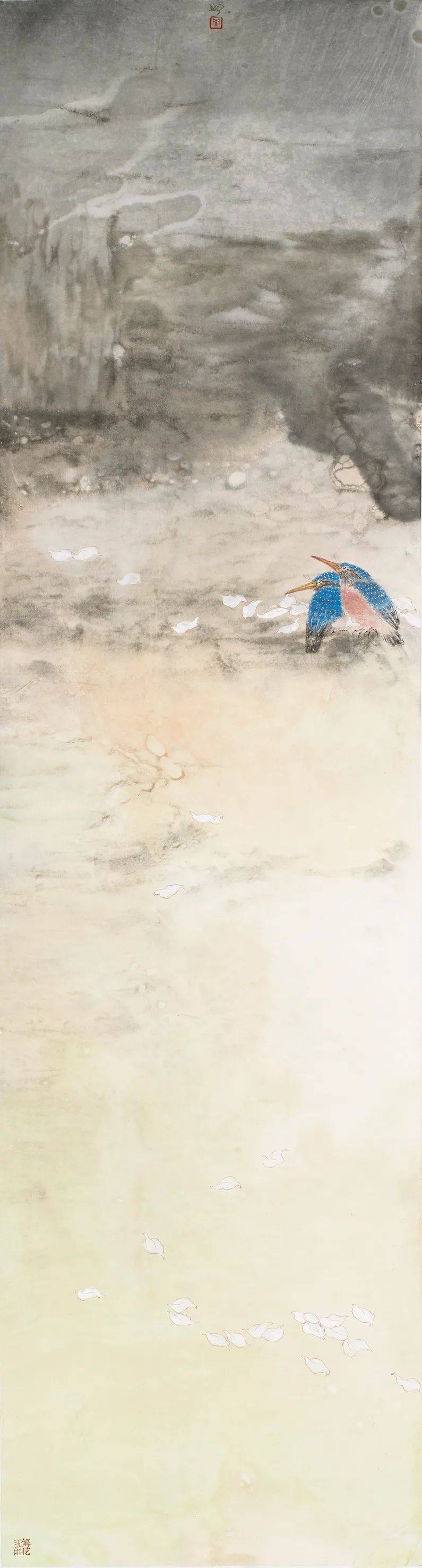 罗翔工笔画的这种“当代性”探索并不意味着他忽视传统,实际上他正是从传统花鸟画体系里走出的当代花鸟画家。在中央美术学院就读本、硕期间,他有幸师从郭怡孮、姚舜熙等先生,跟随他们数度赴西双版纳等地写生,练就了一手白描写生的功底,也像乃师一样擅长密体全景花鸟画。《冬至初寒》《空山新露晚来秋》《润物细语》和《幽林幽谷浴新影》等都代表了新世纪之初他在研习传统之中的出新,画面之中的线与色开始出现一种隔离式的变化。繁密、匀称、精微,或许是这些花鸟画具备一定现代艺术语言的特征。与这种无处不勾、无处不工的全景工笔花鸟画相比,他也探索过水墨花鸟画。这些水墨花鸟并非水墨意笔,而是大面积地在背景上,以色、墨、水相互撞色撞水而出,只有鸟仍然保留着精微勾染的特点。画面整体往往以淡墨为主,意境清幽。在这个相对传统的时期,画于2013年的两幅作品颇惹人注目,一是《北海北》,二是《万物生之瞰》。前者以富于流动感的鹭鸶充盈画面,单色水墨为基调,只有一束斜射的光照进中间那几只鹭鸶。此作并非纯粹的工笔画法,也非鹭鸶祥禽的装饰审美追求,而凸显了群禽在自然之中的生息与狂野。后者则画了并非一般意义上的花与叶,画面中扑飞的硕大的花蝶远远超出了真实的比例。显然,画家在此也试图在审美上突破一种观赏性,而对万物生态引发思考。或许,这两幅作品的实验性才让他最终完成了工笔画的“当代性”转型。