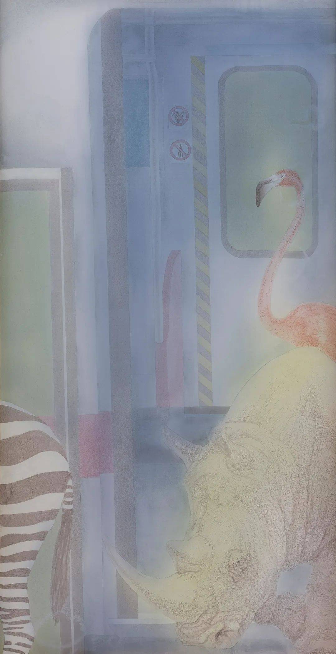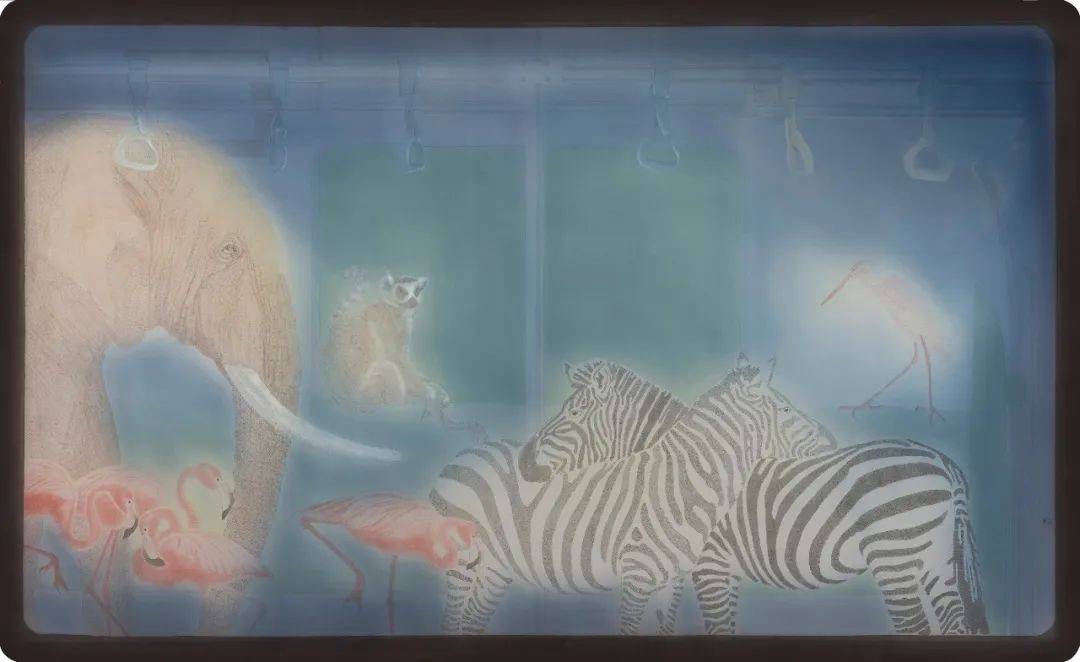 《南锣鼓巷》描写了在地铁玻璃门打开的瞬间,斑马、犀牛、长颈鹿、火烈鸟挤进门时的情景,而一群环尾狐猴早已落座,占据了座位。“南锣鼓巷”这个北京老城区的地标,在此恰恰形成了一种文本与图像的对比性,虽然画家只借用站名“南锣鼓巷”这个文本进行勾联。《晨曦迪士尼》终于在地铁里出现了穿着迪士尼小丑服饰的人的形象,威猛的狮子、顽皮的猴子、高雅的鹭鸶等都专注地观看着他幽默滑稽的形象。画面用细微的晕染表现了晨光熹微之中光色的冷暖交替,仿佛是人们清早赶到迪士尼乐园,却出乎意料地看到了另一番场景。在有关“归”的主题的三幅作品——《归途》《归程》和《归》中,画家描写了大象走出地铁玻璃门的瞬间所流露的迷途知返的一种安然,仍然在玻璃门紧闭之中找不到出口的犀牛、斑马,甚至误把入口当作出口的北极熊的那种焦虑,等等。