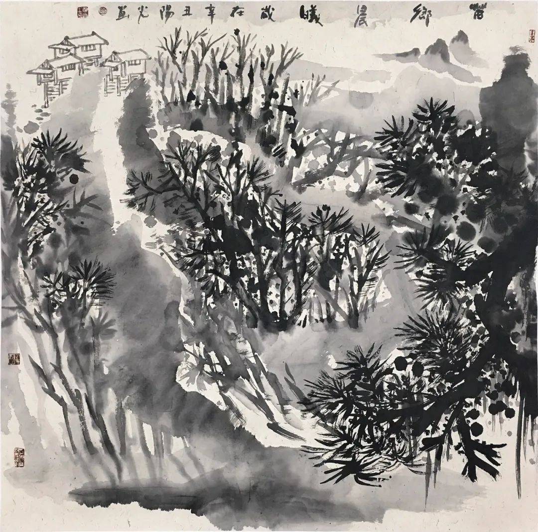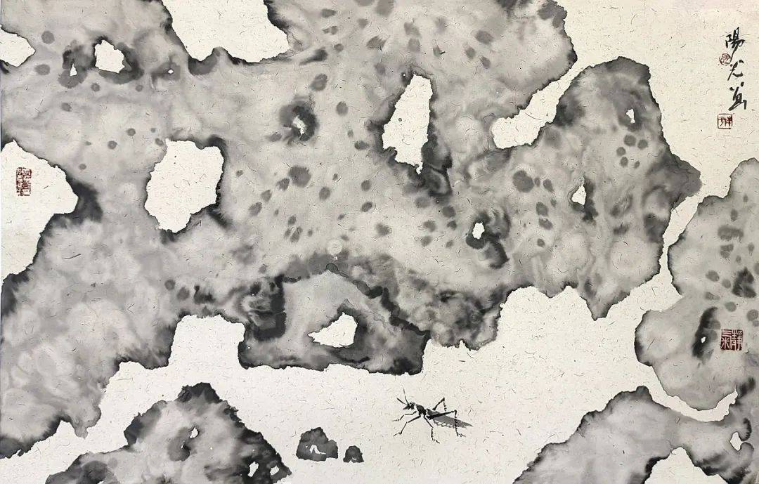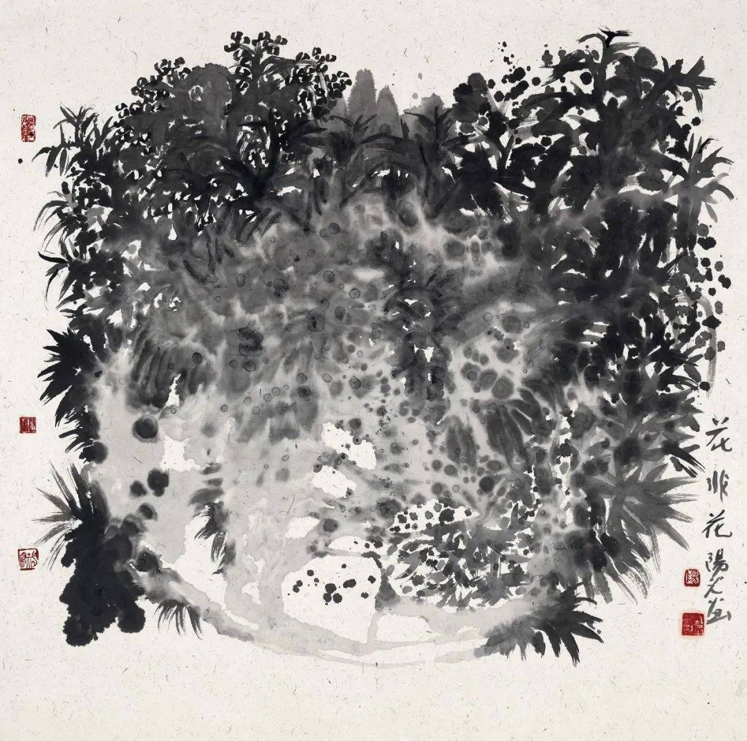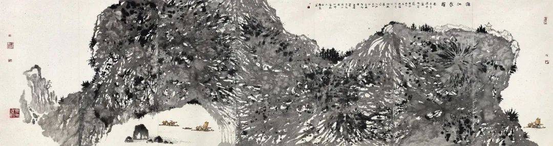 总体而言,阳光所聚焦漓江的山石、花草树木,通过泼墨加皴擦点染、浓淡相破的技法,保留作画过程中的偶然性因素,画面布局吸收现代构成的表现方式,同时保留中国画的笔墨语言,力求一种中西融合的水墨画新气象。在这其中,他所用到的技法是泼墨——水破墨或者墨破水,特别是在大幅作品中撞水、撞墨、撞彩,升华笔墨的美感,从而达到具有冲击力的视觉效果,这需要大破大立的勇气。