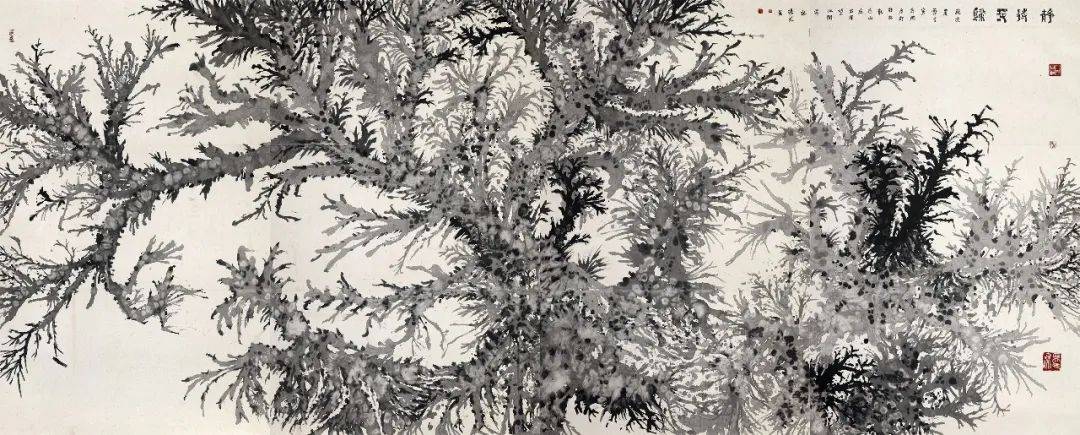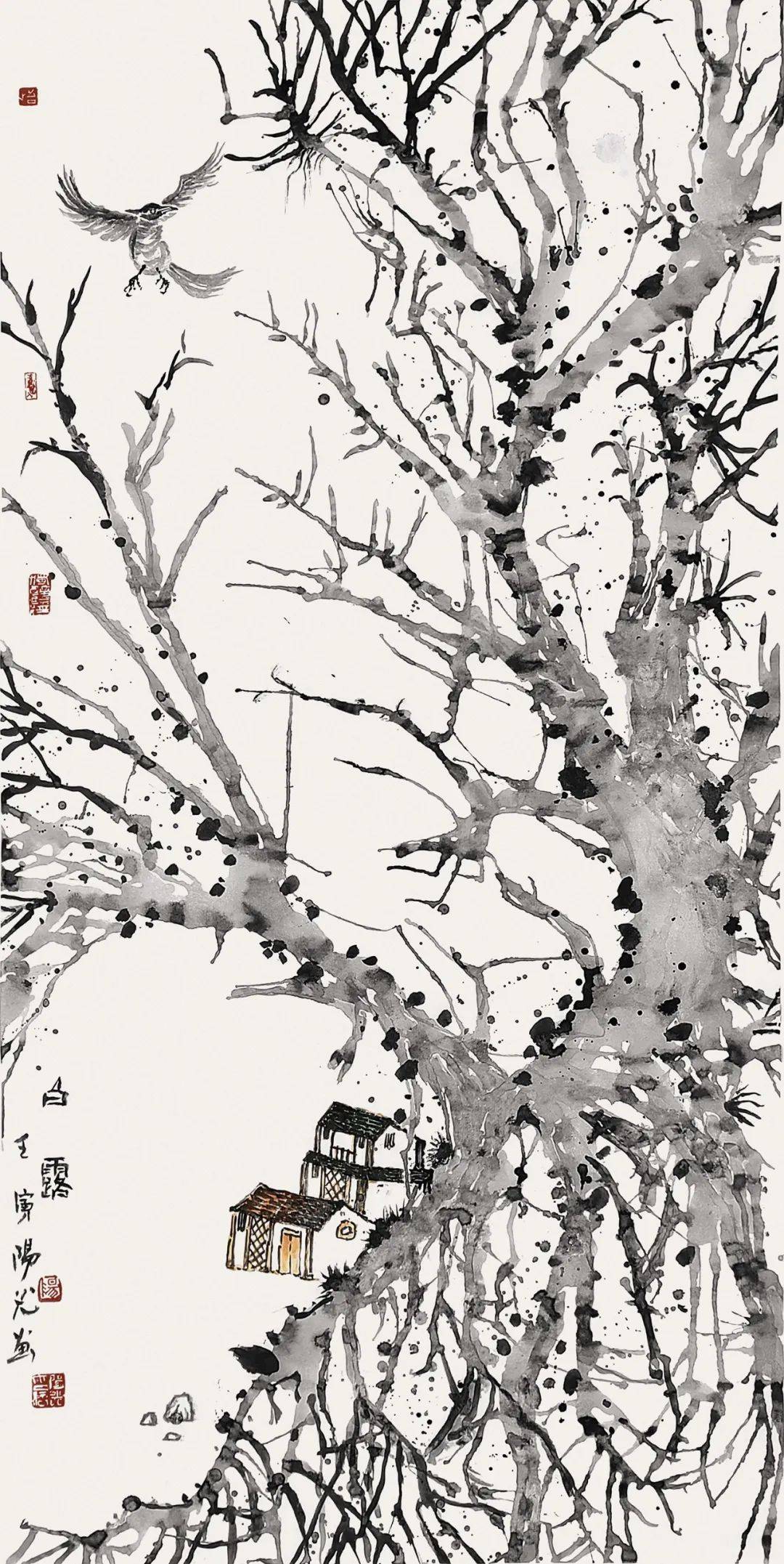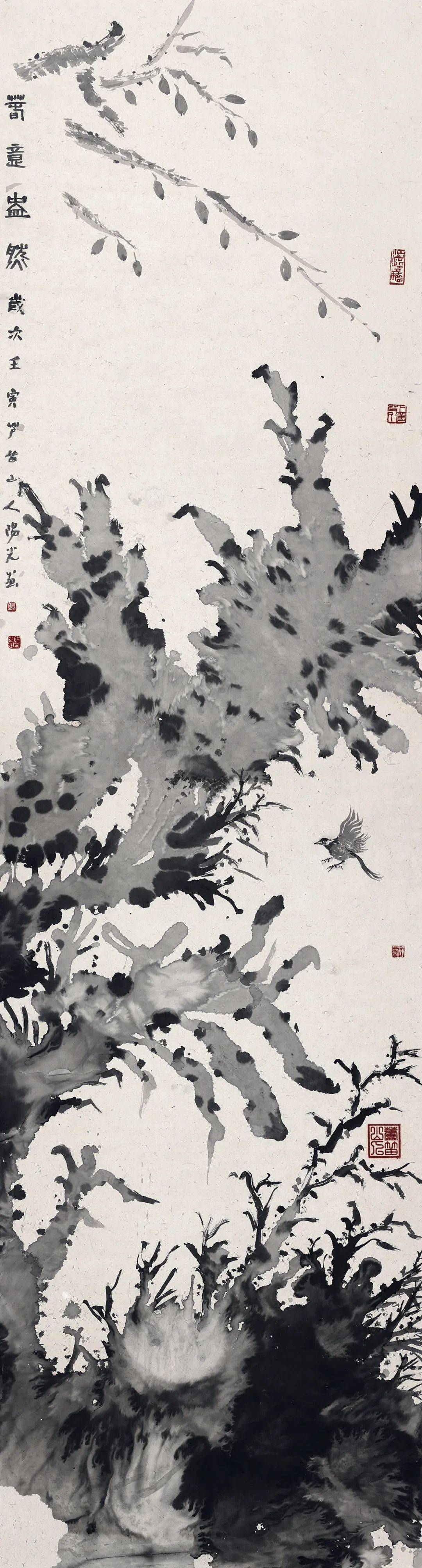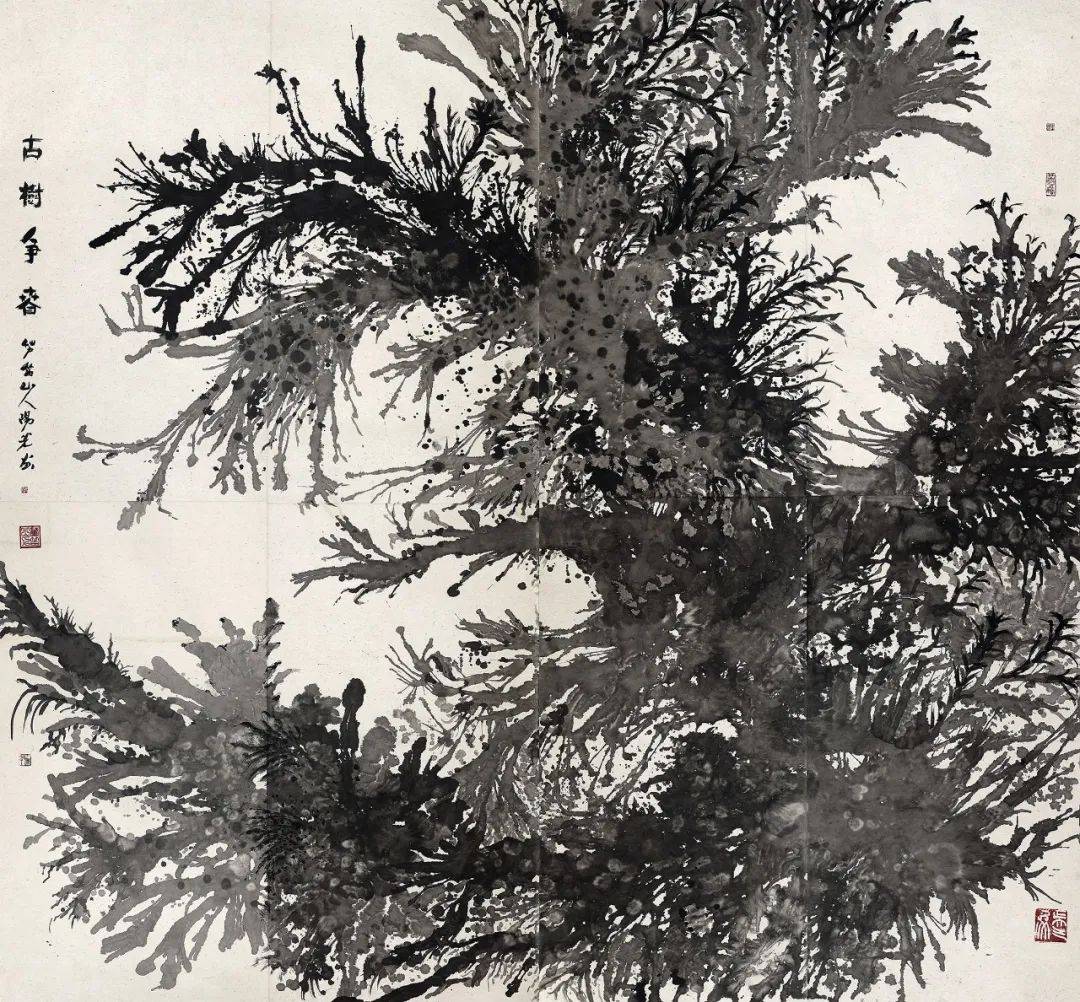 阳光的“古树”系列作品,纯水墨、不着色,满纸老干嫩枝、藤蔓缠绕,原有的山水那种“芦笛逸清音”般的印象,在这里变为重如沉雷般浑茫与浩思。在创作中,阳光将干湿浓淡自由挥写,尔后用墨点苔痕,用水冲撞,勾写与泼染结合,透出“笔晕墨章”的华滋——以古树为代表,进一步呈现出山非山、树非树、石非石、花非花的物象表达,构成了具有现代性的语言图式——阳光画的不是漓江所见到的某种树的品种和外形,而是呈现漓江两岸古树的总体精神和气质,所以称之为“古树之气”,也是时代之气。