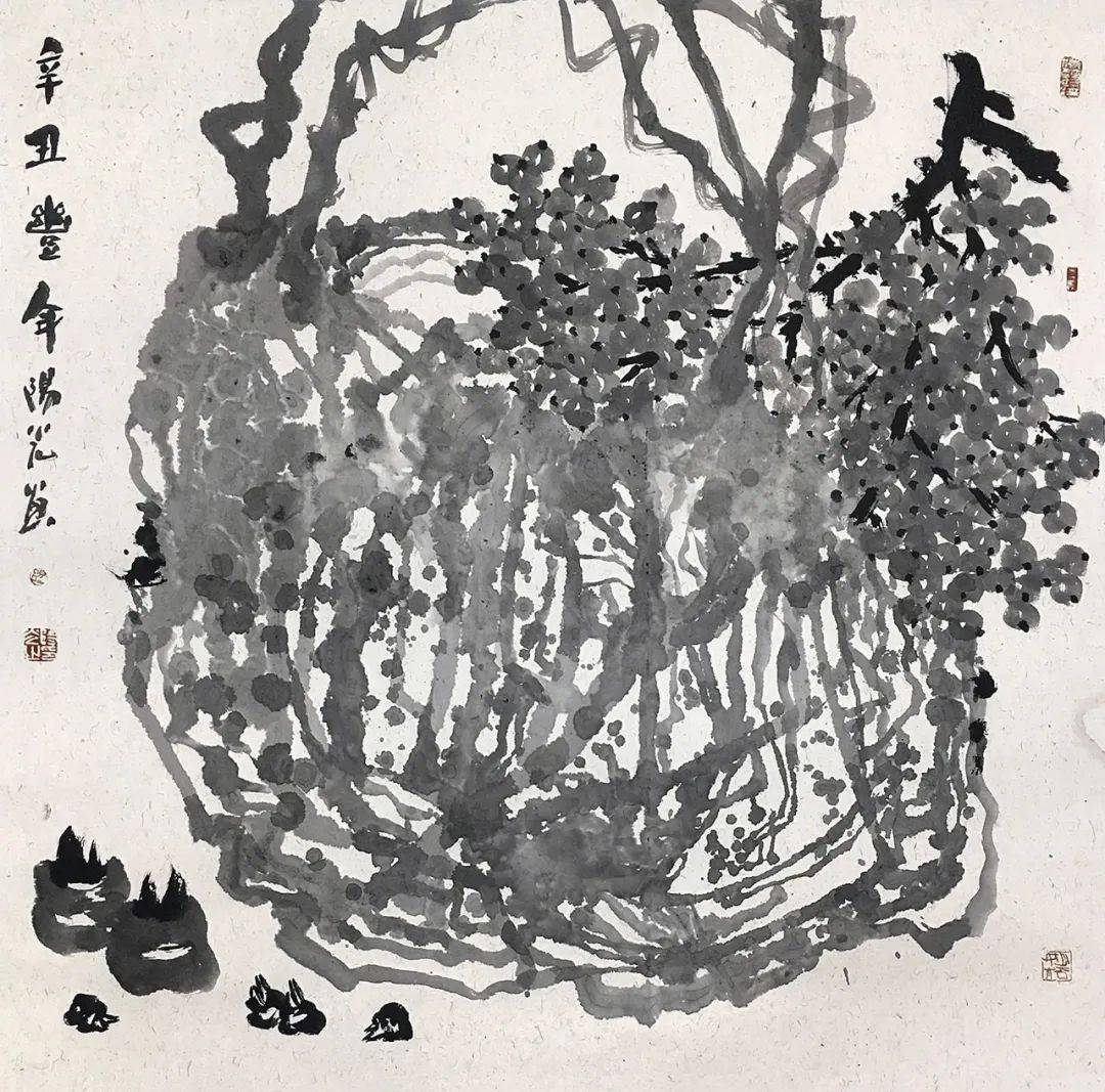在“漓江探源”主题下,阳光近些年画了一些笔简意赅、尺幅较小的作品,以“桂林洞奇石美”“花非花”“家乡风情”诸系列为题。而他的大画,磅礴大气、饱满郁勃、激情满纸:“漓江山水”系列中的《漓江岚韵》,意象的象鼻山在墨迹的变化交汇中,形成一种网状的抽象水墨语言,与写实、精巧的渔船形成鲜明的对比,营造出新异的审美效果;《漓江之源》则用抽象的墨线构成动态很强的图像来表现“源”的主题,充分凸显了创作意图——在笔墨的桂林山水世界中,阳光致力于“自家造稿”,为观者展现出另一番不同风貌的桂林。