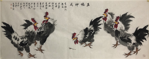 笔墨专业技法的娴熟,在王世军的创作思维里,感觉还不能把雄鸡图画得自有格局!因为他认为,如果只精通技法,不历练写生,画出来的东西难免会存匠气!为了摆脱画匠拘泥,他坚定了师人不如师造化的信念,把身心沉放进养鸡场,每日用尽时辰去写生雄鸡的原生态!真正把雄鸡的形神由自然提炼成心核,每作一件,必是胸有成竹的自信!起笔落笔,可以把雄鸡画得形神兼备,尤贵于神!或一唱天下,或啄争中原,或腾如鸾凤鸣!丰姿多神,惟妙惟肖!
