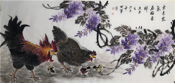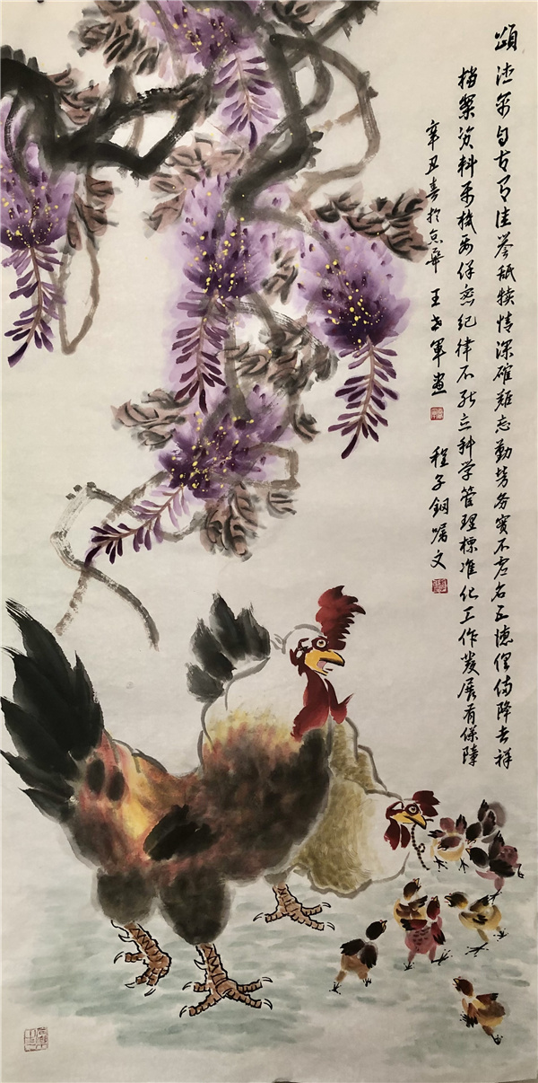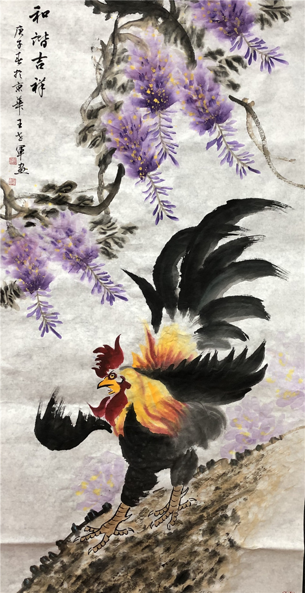 王先生作画,题材广泛,博涉多优,尤其以画雄鸡、紫藤寄寓吉祥而闻名遐迩!能够在画史为自己的艺术造诣赢得重要坐标,不能依靠普通的画题作证!唯有专题专享、独门独技方可以功传春秋,古今相望。比如郑板桥画竹、齐白石画虾都是这种情况。当下,王世军先生以独树一帜的紫藤图雄鸡图,作出了亘古未见的大功勋,成为盛世雄鸡创作的第一笔!也贵有引涉紫气东来的玄机功夫!