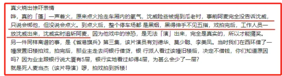 值得一提的是,这部影片中有一场戏,需要把沈威绑在一个淋满汽油的车厢内,他二话没说就答应了。