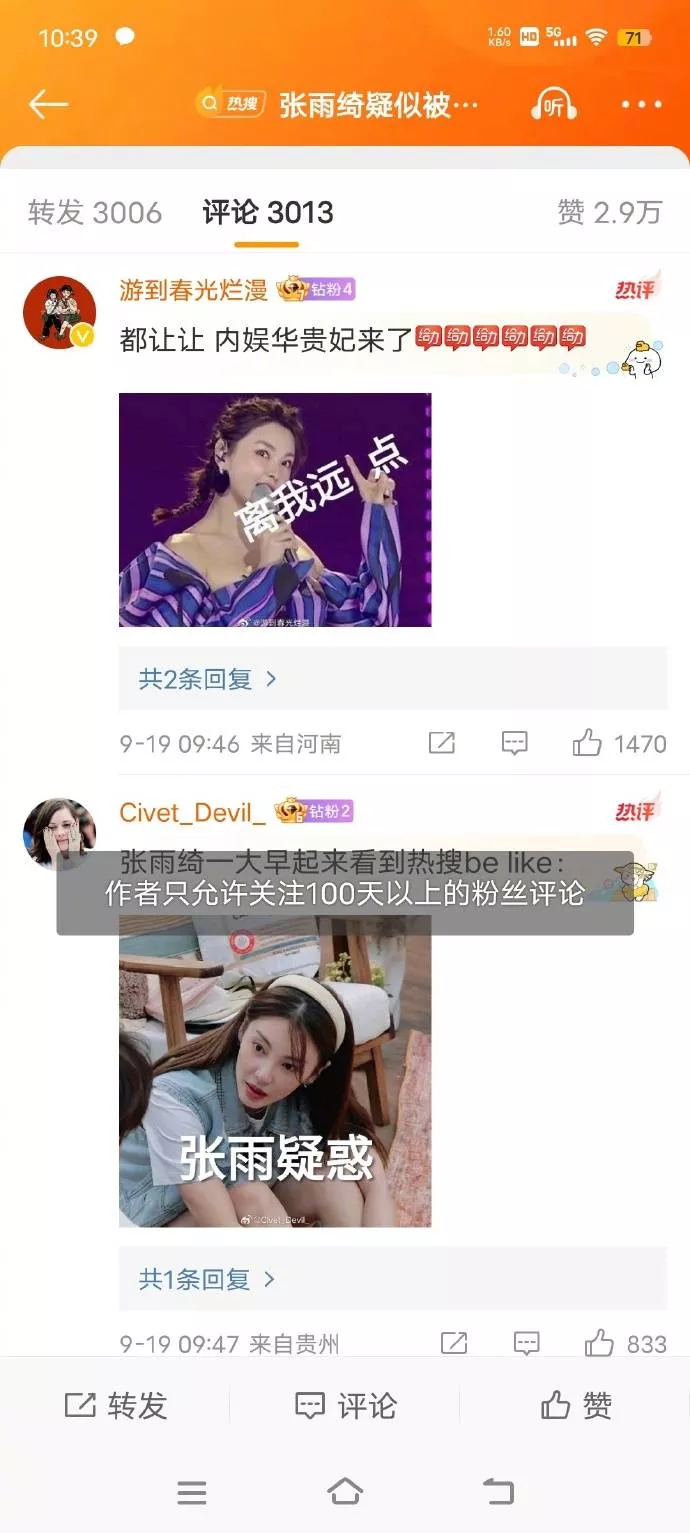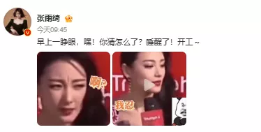 9月19日上午,张雨绮发文:“早上一睁眼,嘿!你猜怎么了?睡醒了!开工~ ”直接晒出自己的表情包,疑似否认被换角,评论设置关注100天以上才能评论。