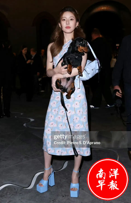 别出心裁地抱着狗登场,一身水蓝色成为整场最亮丽的存在,活泼可爱又俏皮。