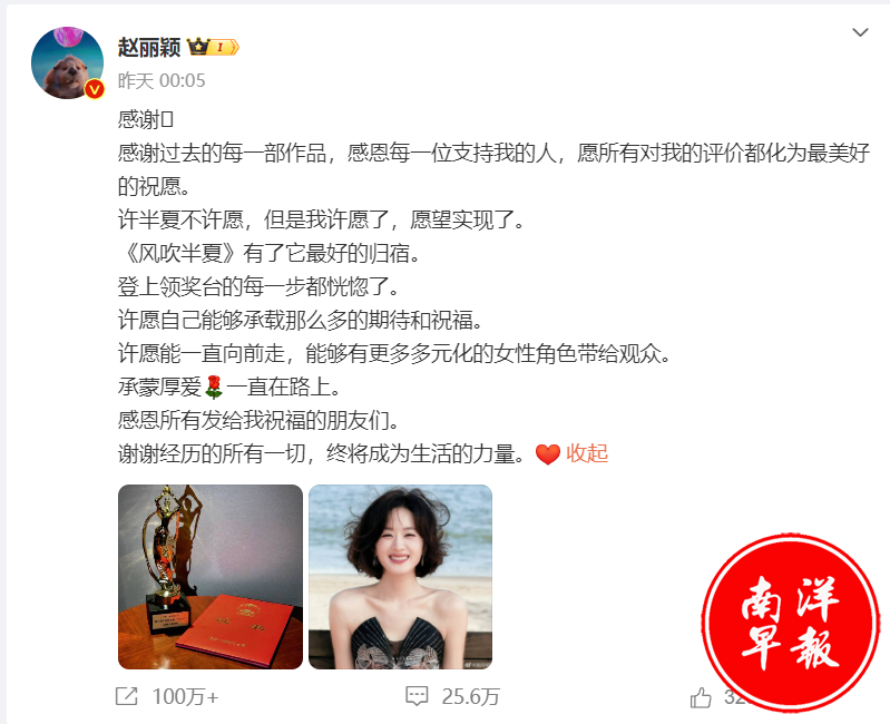 电视剧和电影领域双丰收,赵丽颖高兴,粉丝更高兴。得奖消息一出,就出现了这张赵丽颖得奖复盘图。