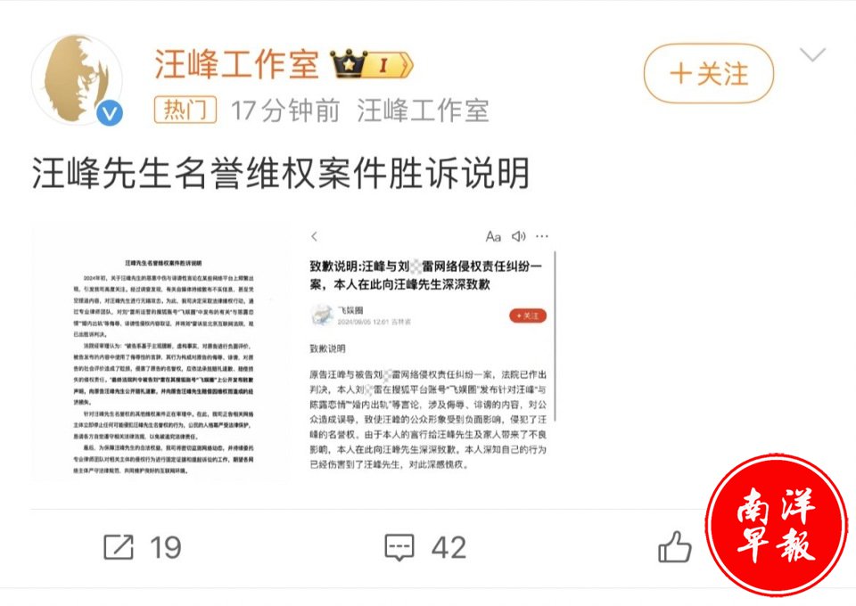 9月5日,汪峰工作室发表维权胜诉声明,汪峰名誉维权案已胜诉,证明了自己婚内出轨系造谣。长期以来,汪峰成为网络谣言的“重灾区”,面对这些无端的指责和造谣,汪峰选择了沉默与忍耐。尤其是在汪峰主动提出和章子怡离婚后,各种各样的无端谣言更是盛行。