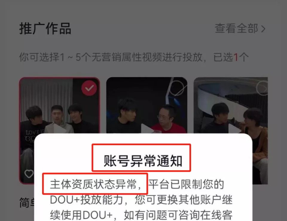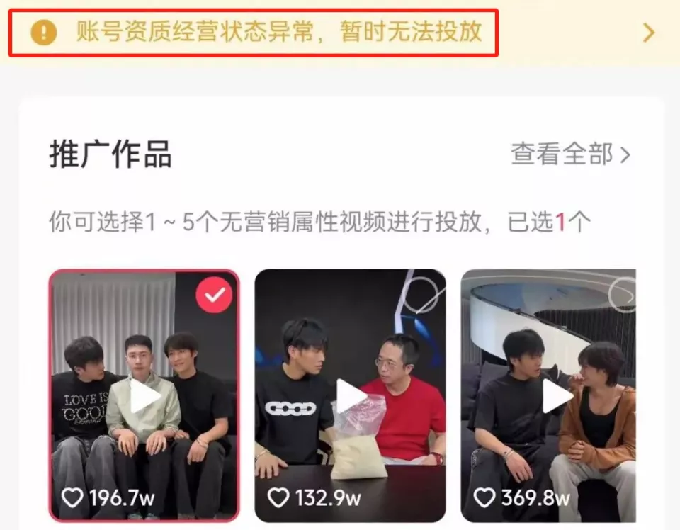 有网友试着帮助小杨哥的账号视频上热门,却发现投抖失败了,小杨哥的账号页面显示经营状态异常,已被平台采取限制措施,因为主体资质状态异常,暂时无法进行投放。