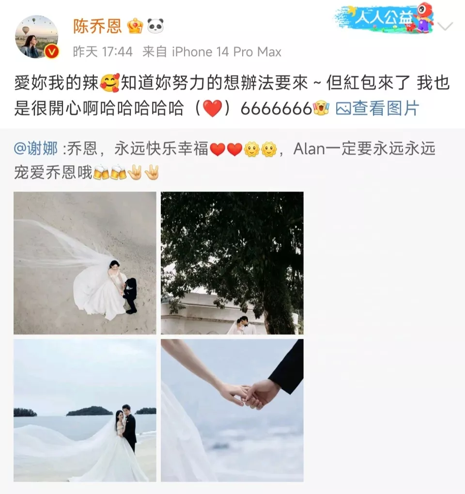 从2019年两人在《女儿们的恋爱》中相识并官宣恋情,到2022年两人领证结婚,再到2024年9月22日举行婚礼,陈乔恩在45岁的时候终于穿上了婚纱,不仅粉丝激动不已,就连她自己都发文称“曾经开玩笑说在戏里穿了200次婚纱,这一次终于穿上了自己的婚纱了”