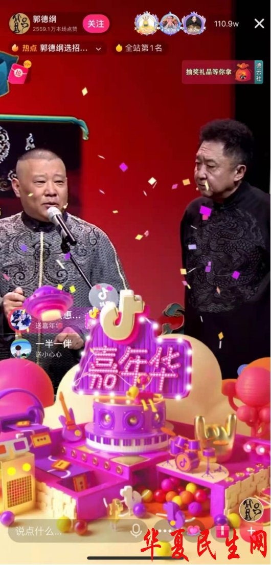 直播过程中,郭德纲和于谦这对20年的搭档默契配合,谈笑间妙趣横生,开场12分钟便快速燃爆直播间,同时在线人数突破100万,峰值高达164万。截至当晚9点直播结束,郭德纲抖音直播间共计收获点赞量近2亿,累计观看人次超3300万,网友纷纷留言互动,掀起一阵阵“过年式”狂欢。