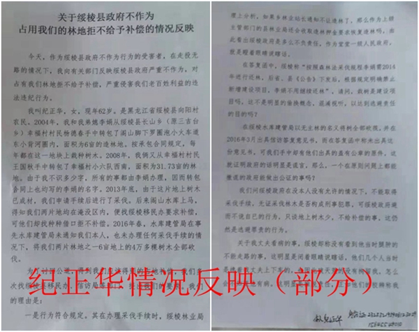 我叫纪正华,女,现年62岁,是黑龙江省绥棱县向阳村农民。2004年,我和我弟媳李娟从绥棱县长山乡(原三吉台乡)幸福村村民杨德春手中转包了阁山脚下罗圈泡小火车道东小背河圈内,面积为6亩的造林地。按承包合同规定,每年都在这一地块上栽种树木。2008年,我俩又从幸福村村民王国秋手中转包了幸福村小六队西南,面积为31.73亩的林地。由于我不识多少字,所有的事都由李娟办理,因而转包合同上也均写的李娟的名字。2013年底,由于这片地上树木已成材,我们申请手续后进行了采伐。后来阁山水库上马,得知我们两片地均在淹没区内,便找绥棱移民办要求补偿,可他们却找种种借口拒不补偿。2016年春,水库建管局在事先水库建管局未通知我们本人,也未办理任何采伐手续的情况下,将我们两片林地之一6亩地上的4万多棵树木全部砍伐。