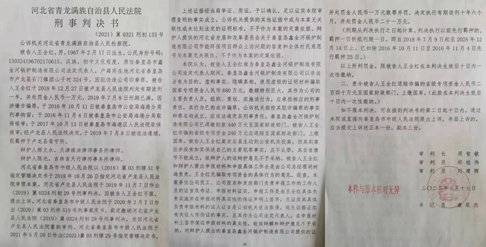 在新闻媒体的监督下,通过两次跟踪报道,2022年3月17日,我丈夫的冤案,由青龙县法院异地重新审理,该院做出(2021)冀0321刑初133号刑事判决书,以伪造公司印章罪,将王全红判刑一年并处罚金1万元,以诈骗罪将王全红改判为十年零六个月,并处罚金21万元。试问;秦皇岛市法院、卢龙县法院、青龙县法院,我丈夫本无罪,三家法院却置无罪证据于不顾,强行判我丈夫王全红有罪,现我丈夫王全红含冤狱中已经五年多。请问,天理何在?法律何在?公正何在?谁来保护我们中小企业的合法权益?