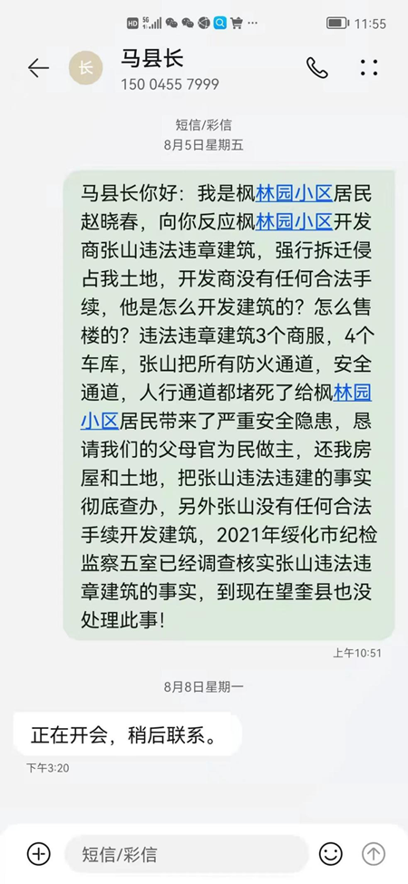 我先后找各主管部门帮我解决房子被强拆的事情,一直没有给予答复。因北京家里有急事,我不得不将房子的事情暂放。今年疫情稍有好转,我特意回来办理房子被强拆的事情。于是,我给望奎县县长马天民打电话、发信息说我房子被开发商张山强拆侵占了。在我房子原来的土地上盖了违法违章建筑商服。然后,马县长让我找主管城建的副县长徐野反映情况,徐野让我找拆迁办,拆迁办让我自然资源局,自然资源局又让我找综合执法局,最后又甩锅到规划局。总之,望奎县各个部门我都找遍了,也没有人给我解决问题、到处推诿不作为至今无果。后来,我又给马天民县长打电话,电话不接、信息不回、人也不让见。无奈之下,我又向望奎县主管城市建设的副县长徐野反映开发商张山违法违章建筑问题。
