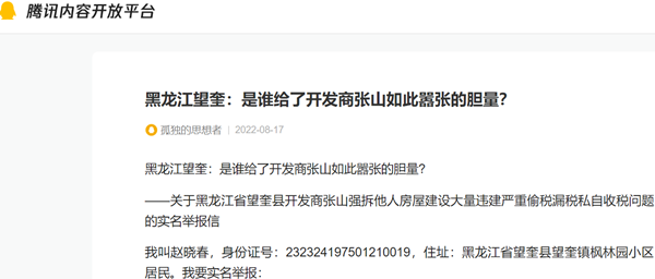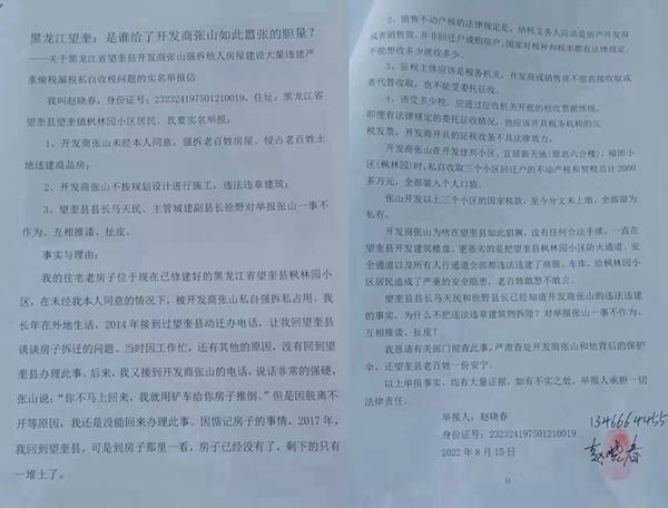——关于黑龙江省望奎县开发商张山强拆他人房屋建设大量违建严重偷税漏税私自收税问题的实名举报信