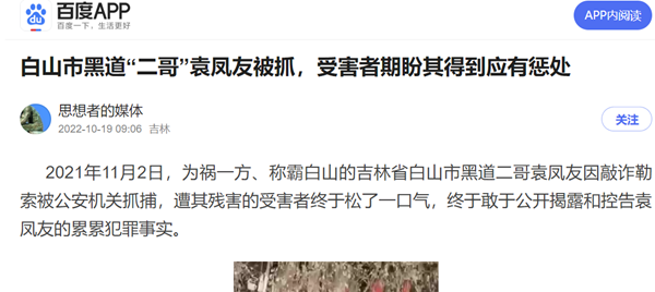 2021年11月2日,为祸一方、称霸白山的吉林省白山市黑道二哥袁凤友因敲诈勒索被公安机关抓捕,遭其残害的受害者终于松了一口气,终于敢于公开揭露和控告袁凤友的累累犯罪事实。