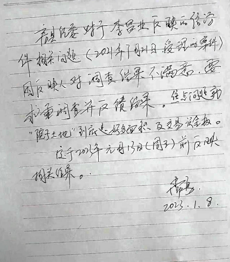 2021年11月17日,根据李昌业的请求,房县纪委给予书面反馈:对关于文件丢失的原因,房县纪委以种种借口拒不调查,掩盖事实真相。而关于万天虎将国有土地私自交易问题,经查只有10.36平米。李昌业对该调查反馈意见极为不满,认为调查结果严重违背事实,请求房县纪委重新立案调查,在此后时间内向十堰市纪委、湖北省纪委递交材料,得到回复均是该案发生在房县,根据纪委有关规定必须由房县纪委调查处理。而房县纪委的回复是在2021年11月17日房县纪委已做出了回复,这就是房县纪委的最后结论。