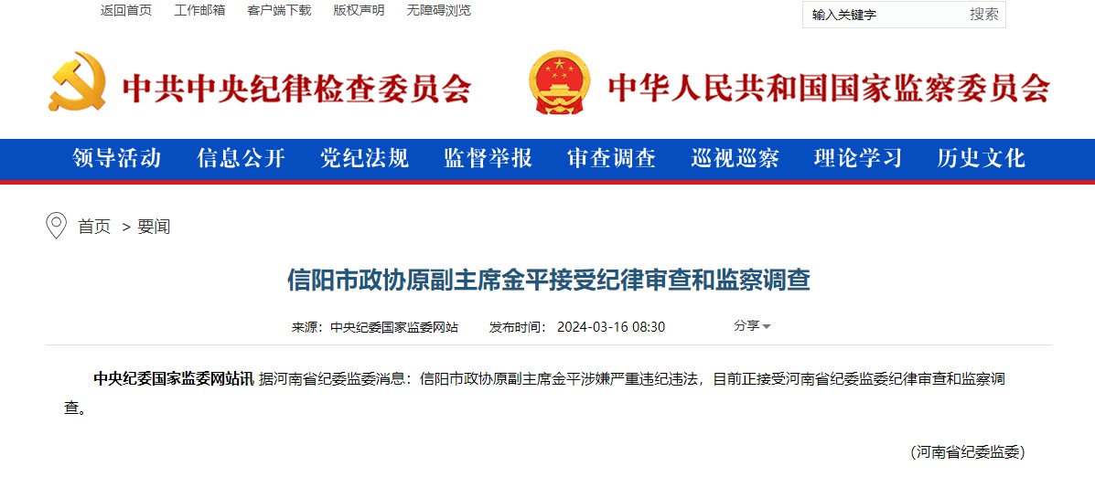 中央纪委国家监委网站讯 据河南省纪委监委消息:信阳市政协原副主席金平涉嫌严重违纪违法,目前正接受河南省纪委监委纪律审查和监察调查。
