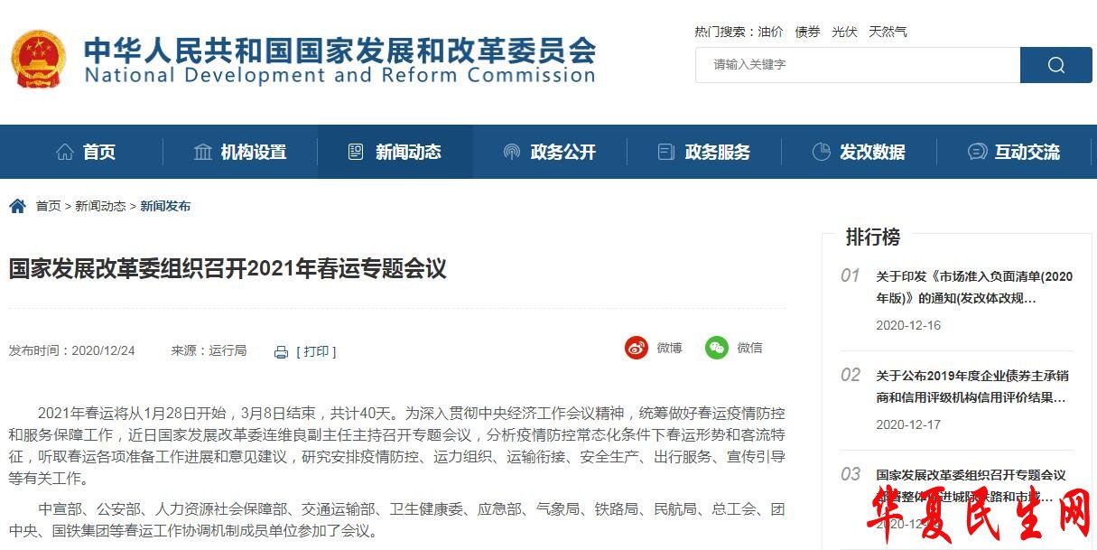 中国网12月24日讯 据国家发展改革委网站今日消息,2021年春运将从1月28日开始,3月8日结束,共计40天。为深入贯彻中央经济工作会议精神,统筹做好春运疫情防控和服务保障工作,国家发展改革委近日组织召开2021年春运专题会议,分析疫情防控常态化条件下春运形势和客流特征,听取春运各项准备工作进展和意见建议,研究安排疫情防控、运力组织、运输衔接、安全生产、出行服务、宣传引导等有关工作。