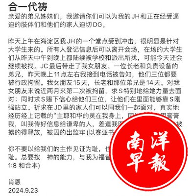 昨天,北京锡安教会海淀堂点主日受冲击。该堂点主要服侍大学生,参加聚会的大学生在当晚相继被学校和派出所约谈。