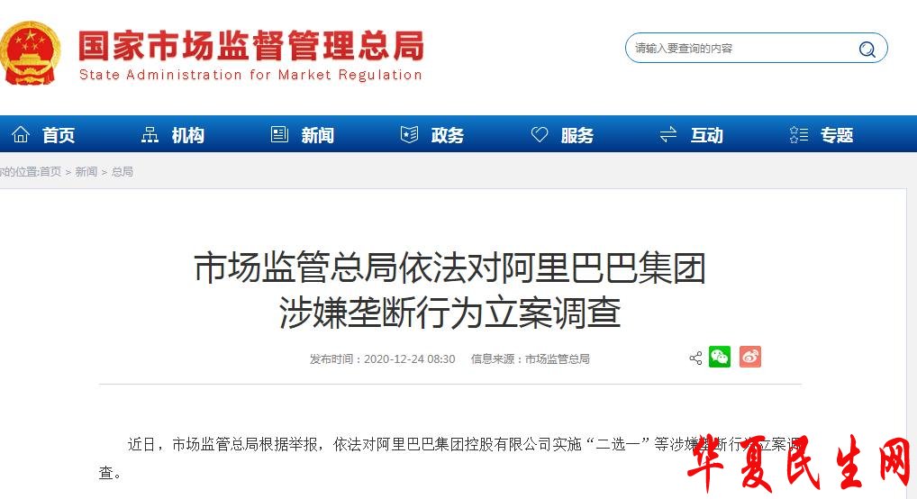 中国网12月24日讯 据国家市场监督管理总局网站今日消息,近日,市场监管总局根据举报,依法对阿里巴巴集团控股有限公司实施“二选一”等涉嫌垄断行为立案调查。