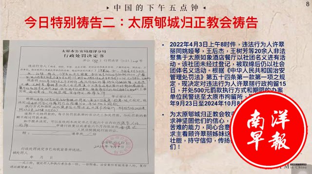 太原郇城归正教会许翠丽因在202243日与教会弟兄姐妹在酒店餐厅吃饭聚集被当地警方处以行政拘留15日,并处500元罚款。由于当时是疫情期间延期执行,许翠丽姐妹于昨日被行政拘留。