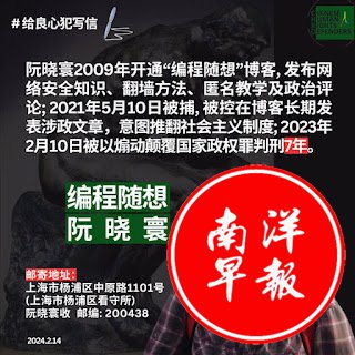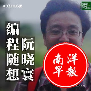 阮晓寰:网名“编程随想”。1977610日出生,福建省泉州市人,上海市杨浦区民京路558号长住居民,网络安全工程师,民主异见人士,中国在押政治犯。