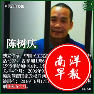2024年9月26日是陈树庆 59岁生日,他在狱中服刑已超过10年。2014年9月14日,陈树庆被以 颠覆国家政权罪刑拘,2016年6月17日被以同罪名判刑10年6个月。陈树庆曾参加1986年和1989年两次学运; 2007年8月曾被判刑4年。
